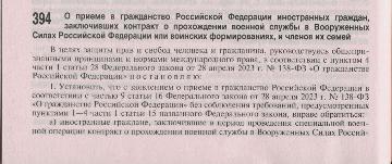 «О приеме в гражданство Российской Федерации иностранных граждан, заключивших контракт о прохождении военной службы в Вооруженных Силах Российской Федерации или воинских формированиях, и членов их семей» : указ Президента Российской Федерации от 04.01.2024 № 10 // Собрание законодательства Российской Федерации. – 2024. – № 2. – С. 2294-2295 (ст. 394). |
