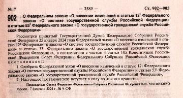 О Федеральном законе "О внесении изменений в статью 12-1 Федерального закона "О системе государственной службы Российской Федерации" и статью 53-1 Федерального закона "О государственной гражданской службе Российской Федерации" : Постановление Совета Федерации Федерального Собрания Российской Федерации от 07.02.2024 № 9-СФ // Собрание законодательства Российской Федерации. – 2024. – № 7. – С. 3589 (ст. 902). |