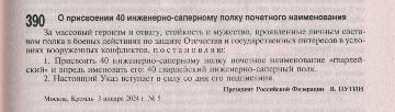 О присвоении 40 инженерно-саперному полку почетного наименования : указ Президента Российской Федерации от 03.01.2024 № 5 // Собрание законодательства Российской Федерации. – 2024. – № 2. – С. 2293 (ст. 390). |