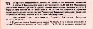 О проекте федерального закона № 336340-8 "О внесении изменений в статью 2 Федерального закона от 7 ноября 2011 г. № 306-ФЗ "О денежном довольствии военнослужащих и предоставлении им отдельных выплат" и статью 2 Федерального закона от 19 июля 2011 г. № 247-ФЗ "О социальных гарантиях сотрудникам органов внутренних дел Российской Федерации и внесении изменений в отдельные законодательные акты Российской Федерации" : Постановление Государственной Думы Федерального Собрания Российской Федерации от 25.01.2024 № 5643-8 ГД // Собрание законодательства Российской Федерации. – 2024. – № 6. – С. 3349 (ст. 775). |