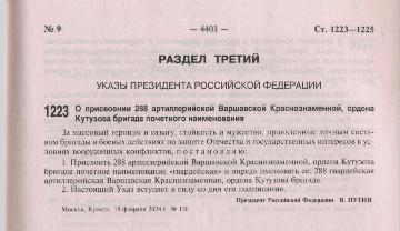 О присвоении 288 артиллерийской Варшавской Краснознаменной, ордена Кутузова бригаде почетного наименования : указ Президента Российской Федерации от 19.02.2024 № 130 // Собрание законодательства Российской Федерации. – 2024. – № 9. – С. 4401 (ст. 1223) |