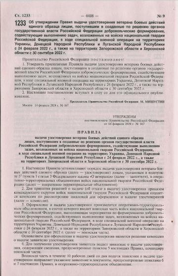 Об утверждении Правил выдачи удостоверения ветерана боевых действий единого образца лицам, поступившим в созданные по решению органов государственной власти Российской Федерации добровольческие формирования, содействующие выполнению задач, возложенных на войска национальной гвардии Российской Федерации, в ходе специальной военной операции на территориях Украины, Донецкой Народной Республики и Луганской Народной Республики с 24 февраля 2022 г., а также на территориях Запорожской области и Херсонской области с 30 сентября 2022 г. : Постановление Правительства Российской Федерации от 14.02.2024 № 167 // Собрание законодательства Российской Федерации. – 2024. – № 9. – С. 4408 (ст. 1233). |
