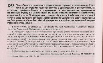 Об особенностях правового регулирования трудовых отношений с работниками, заключившими трудовой договор с организациями, расположенными в районах Крайнего Севера и приравненных к ним местностях, призванными на военную службу по мобилизации или заключившими контракт в соответствии с пунктом 7 статьи 38 Федерального закона "О воинской обязанности и военной службе" либо контракт о добровольном содействии в выполнении задач, возложенных на Вооруженные Силы Российской Федерации или войска национальной гвардии Российской Федерации : Постановление Правительства Российской Федерации от 21.02.2024 № 200 // Собрание законодательства Российской Федерации. – 2024. – № 9. – С. 4488 (ст. 1252). |