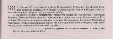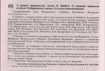 О внесении изменения в статью 18 Федерального закона "О статусе военнослужащих": постановление Государственной Думы Федерального Собрания Российской Федерации от 16.01.2024 № 5547-8 ГД О проекте федерального закона № 405066-8 // Собрание законодательства Российской Федерации. – 2024. – № 4. – С. 2846 (ст. 475). |