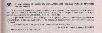 О присвоении 55 отдельной мотострелковой бригаде (горной) почетного наименования : указ Президента Российской Федерации от 03.01.2024 № 4 // Собрание законодательства Российской Федерации. – 2024. – № 2. – С. 2293 (ст. 389). |