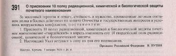 «О присвоении 10 полку радиационной, химической и биологической защиты почетного наименования» : Указ Президента Российской Федерации от 03.01.2024 № 6 // Собрание законодательства Российской Федерации. – 2024. – № 2. – С. 2293 (ст. 391). |