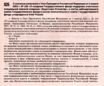 О внесении изменений в Указ Президента Российской Федерации от 3 апреля 2023 г. № 232 "О создании Государственного фонда поддержки участников специальной военной операции "Защитники Отечества", в состав наблюдательного совета Государственного фонда и состав попечительского совета Государственного фонда, утвержденные этим Указом : указ Президента Российской Федерации от 03.02.2024 № 85 // Собрание законодательства Российской Федерации. – 2024. – № 6. – С. 3395 (ст. 826). |