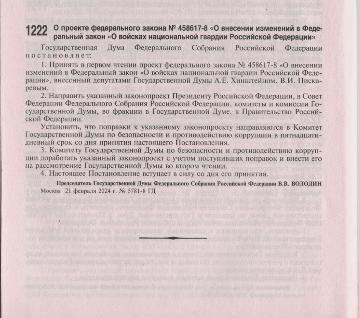 О проекте федерального закона № 458617-8 "О внесении изменений в Федеральный закон "О войсках национальной гвардии Российской Федерации" : Постановление Государственной Думы Федерального Собрания Российской Федерации от 21.02.2024 № 5781-8 ГД // Собрание законодательства Российской Федерации. – 2024. – № 9. – С. 4400 (ст. 1222). |