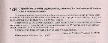 О присвоении 25 полку радиационной, химической и биологической защиты почетного наименования : указ Президента Российской Федерации от 19.02.2024 № 131 // Собрание законодательства Российской Федерации. – 2024. – № 9. – С. 4401 (ст. 1224). |
